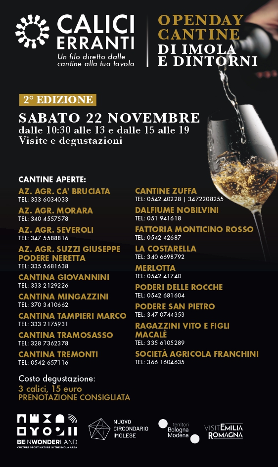 Il Nuovo Circondario Imolese, nell’ambito del progetto PTPL co-finanziato dalla Città Metropolitana di Bologna, presenta la seconda edizione di “Calici Erranti”, l’evento enoturistico che sabato 22 novembre vedrà coinvolte 18 cantine del territorio, tutte pronte ad accogliere il pubblico con visite, degustazioni e momenti culturali.