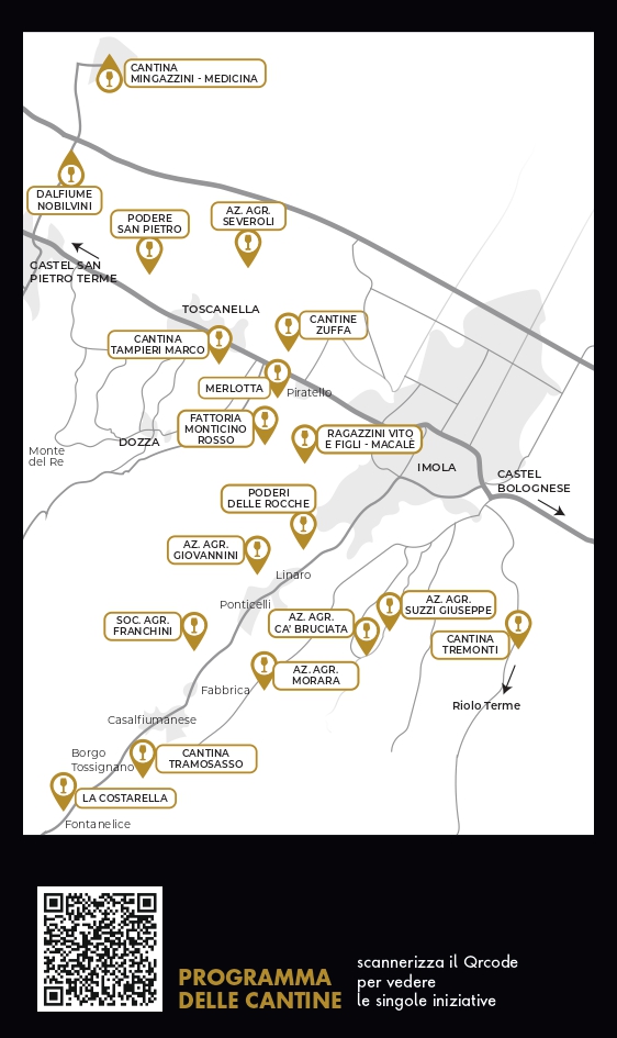 Per tutti i dettagli, gli indirizzi, i contatti e la mappa delle cantine è possibile consultare la pagina dedicata sul sito del Nuovo Circondario Imolese: