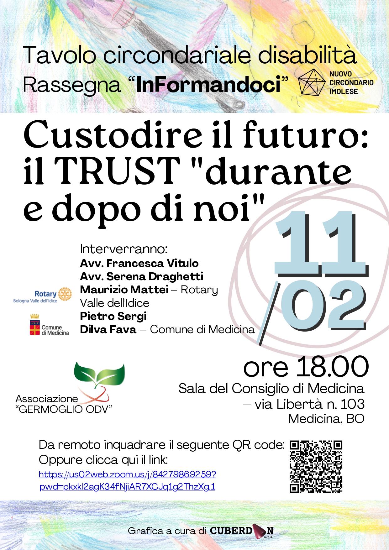 Il secondo appuntamento della rassegna si terrà mercoledì 11 febbraio presso la Sala del Consiglio comunale di Medicina (via Libertà 103 – Medicina) e sarà dedicato al tema “Custodire il futuro: il Trust durante e dopo di noi”, con particolare attenzione alla tutela, all’autonomia e alla progettazione del futuro delle persone con disabilità. Interverranno l’Assessore Dilva Fava del Comune di Medicina, Maurizio Mattei del Rotary Valle dell’Idice, gli avvocati Francesca Vitulo e Serena Draghetti e Pietro Sergi, che porterà il contributo della propria esperienza.