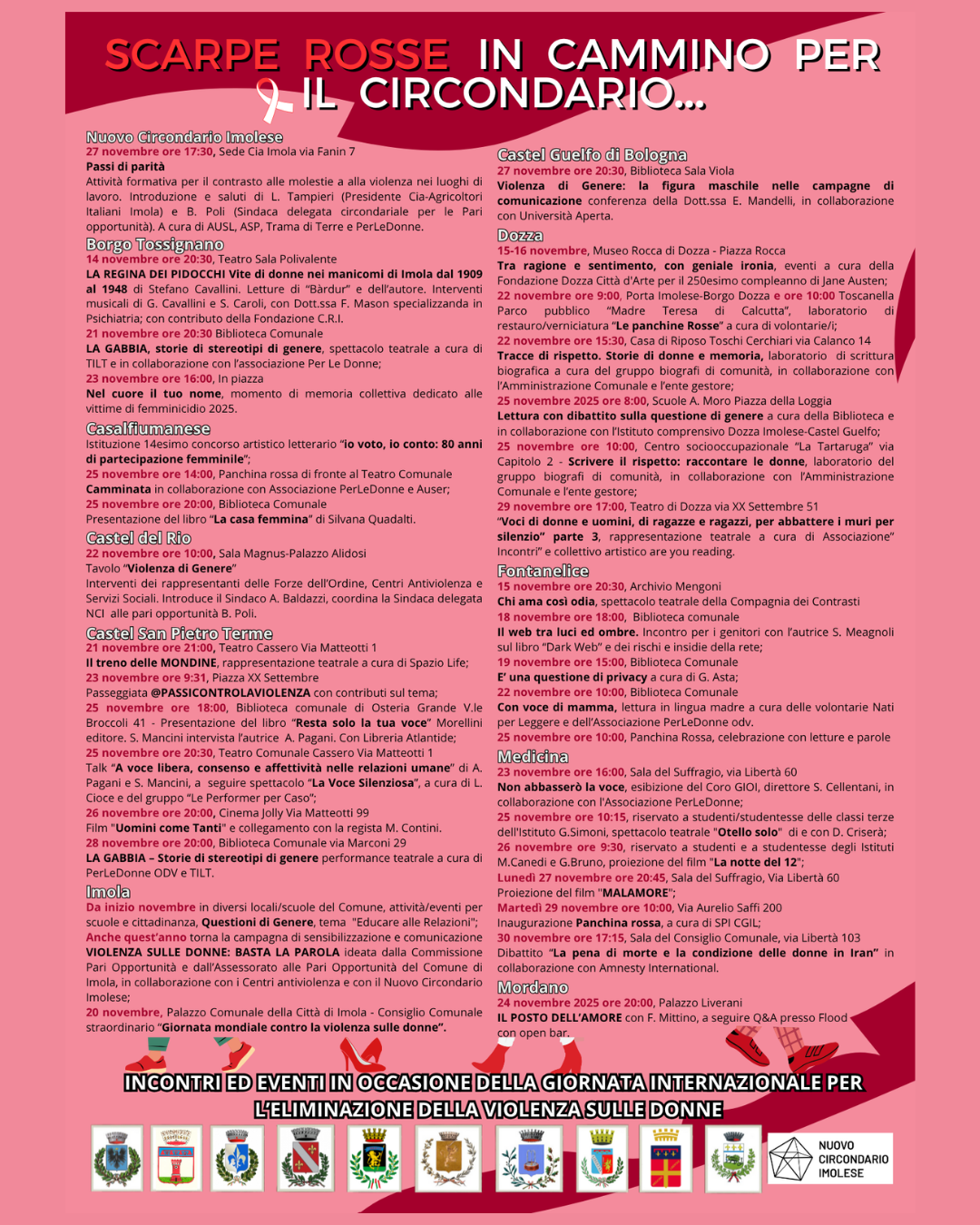 In occasione della Giornata internazionale per l’eliminazione della violenza contro le donne, i Comuni del Nuovo Circondario Imolese, attraverso la Conferenza Assessori Pari Opportunità, hanno elaborato e condiviso un ricco programma di eventi e iniziative di sensibilizzazione e informazione sulla delicata e attuale tematica. Ogni municipio, con le proprie specificità e sensibilità, ha contribuito alla realizzazione di un cartellone eterogeneo di incontri, campagne e momenti di riflessione, con l’obiettivo di rafforzare la consapevolezza collettiva e promuovere una cultura fondata sul rispetto e la parità di genere. Un calendario che i Comuni, passo dopo passo, hanno presentato raccontando i dettagli e le collaborazioni avviate per la la valorizzazione di ogni appuntamento.