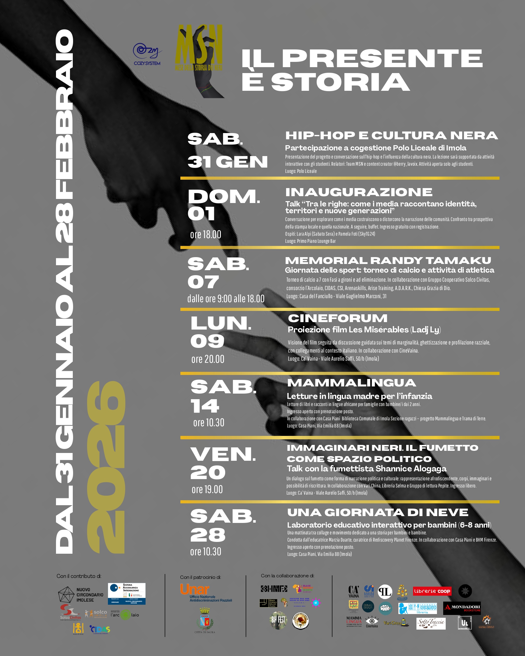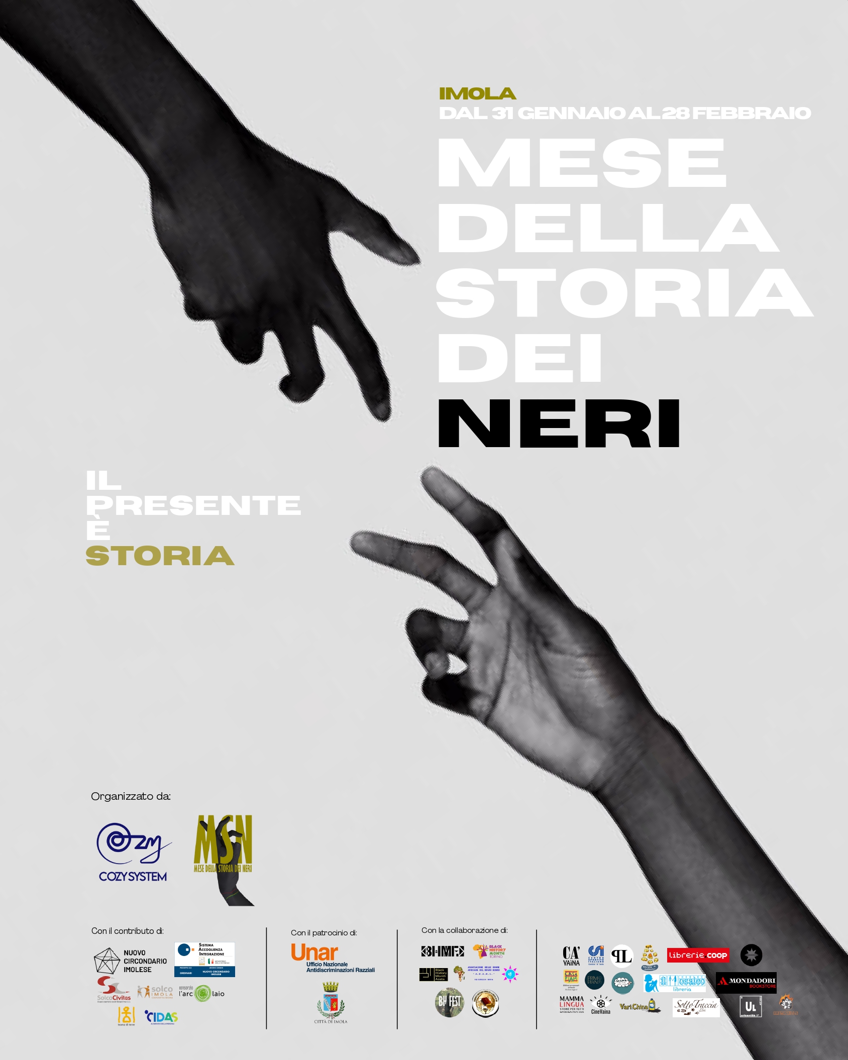 Il Mese della Storia dei Neri si realizza grazie alla collaborazione e al contributo di numerose realtà culturali, educative, sociali e sportive del territorio e a livello nazionale, che hanno partecipato alla progettazione e alla realizzazione delle diverse iniziative in programma.