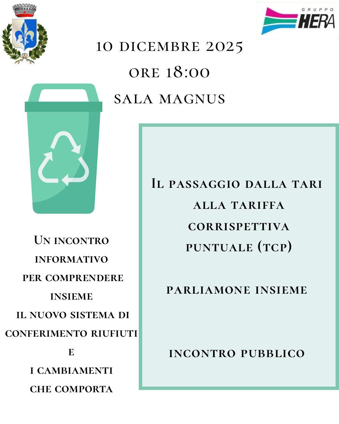 Saranno presenti, oltre all'Amministrazione comunale, rappresentanti di Hera, gestore del servizio di raccolta e smaltimento rifiuti.
