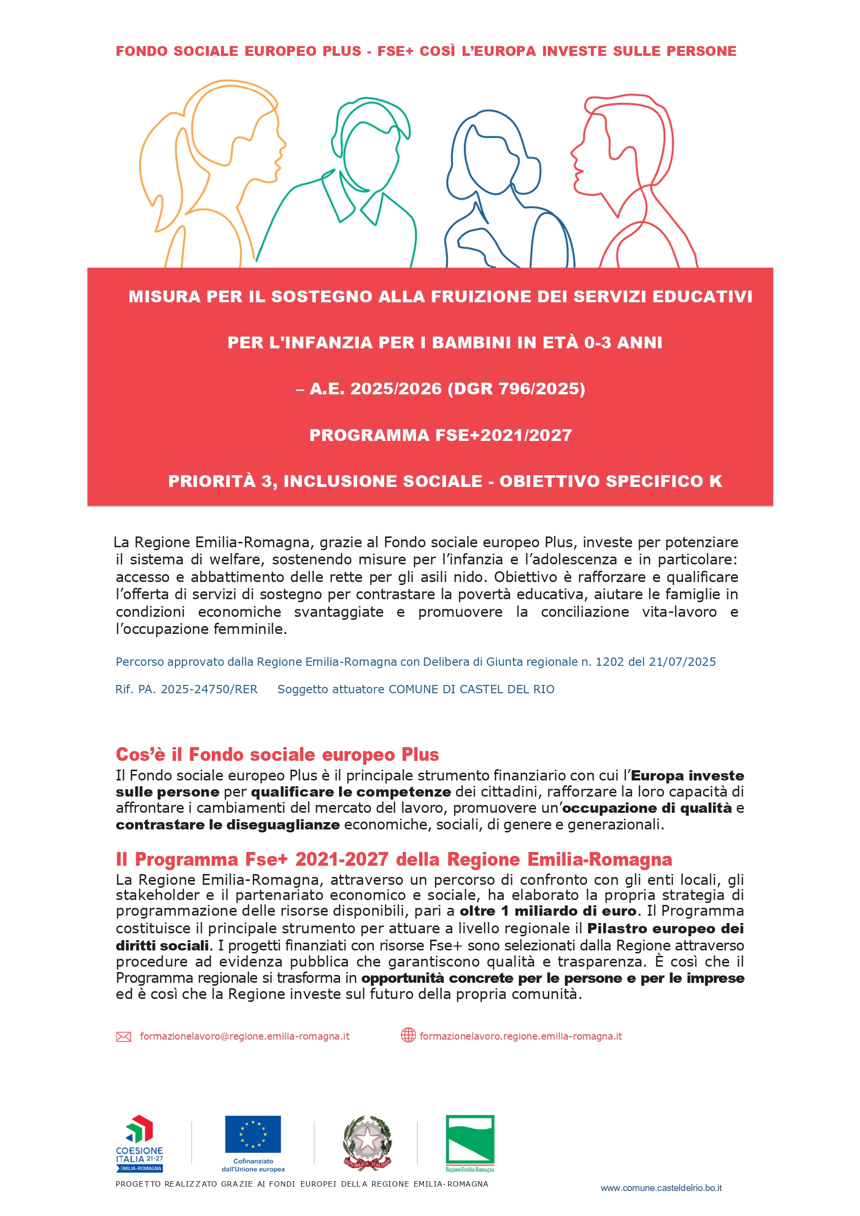 In continuità con l’a.e. 2023/2024 e 2024/2025 il Programma regionale FSE+, nell’ambito della priorità 3. Inclusione sociale Obiettivo specifico k), prevede un investimento straordinario per attivare misure economiche per l’ampliamento delle opportunità e l’abbattimento delle rette, per promuovere l’ accesso ai servizi educativi 0–3 anni, per migliorare l'accesso paritario e tempestivo a servizi di qualità, sostenibili e a prezzi accessibili come misura di contrasto alla povertà educativa.