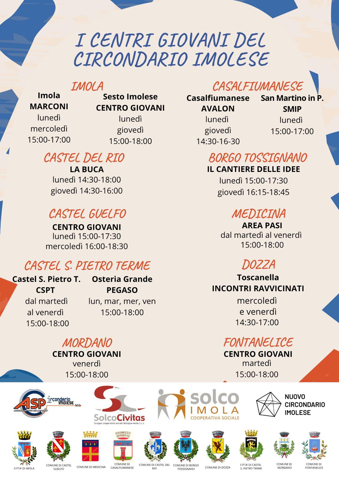 Le Amministrazioni Comunali del Nuovo Circondario Imolese a seguito della co-progettazione tra Asp e Cooperativa Solco Civitas sono pronte alla riapertura dei Centri Giovani in tutti i Comuni del territorio, a partire da ottobre 2025. L’avvio delle attività dei centri giovani rappresenta un'importante opportunità per i giovani di aggregazione, socializzazione e sviluppo di nuove abilità in un ambiente sicuro e accogliente. La progettualità avrà durata biennale 2025 - 2027.
