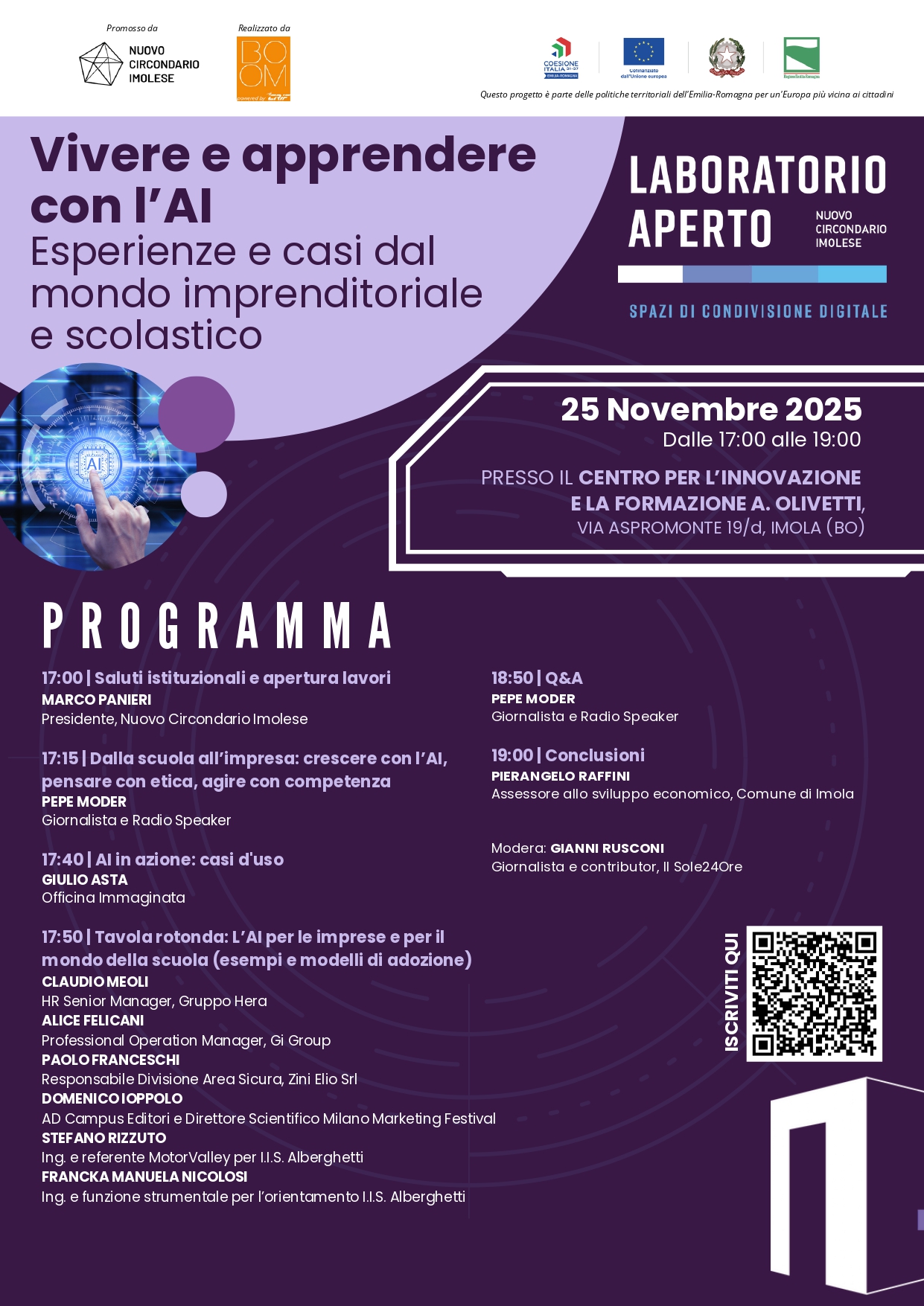 Ad inaugurare l’evento pubblico del 25 novembre saranno i saluti istituzionali di Marco Panieri, Sindaco di Imola e Presidente del Nuovo Circondario Imolese. Seguiranno interventi di esperti ed esponenti dell’ecosistema aziendale e scolastico, che offriranno uno sguardo approfondito sull’IA e su come stia influenzando competenze, etica e opportunità nel mondo del lavoro e nella società.
