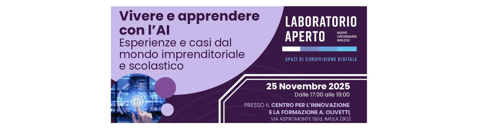 Martedì 25 novembre 2025, a partire dalle ore 17.00, presso il nuovo Centro per l’Innovazione e la Formazione A. Olivetti a Imola, si terrà un evento aperto alla cittadinanza dal titolo “Vivere e apprendere con l'AI: esperienze e casi dal mondo imprenditoriale e scolastico”, un appuntamento dedicato a esplorare i cambiamenti dettati dall’avvento dell’Intelligenza Artificiale. Esperti, aziende e scuole si confronteranno su competenze, etica e opportunità concrete per preparare le nuove generazioni al mondo del lavoro. Dalla personalizzazione digitale alla salute, dall’educazione all’inclusione: uno spazio per capire, dialogare e immaginare il futuro.
